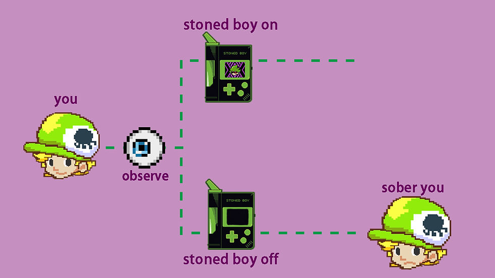 也就是說我們在結果造成的時候去觀察會干涉過去的選擇?說好的在盯著Stoned Boy的時候有沒有變身成wizman兩者的我同時存在的呢?所以是之後變身wizman的我決定了現在選擇turn on Stoned Boy的我嗎?(如果讀到這裡你還是沒有Stoend Boy那就不用糾結,未來的你沒有可能決定了)